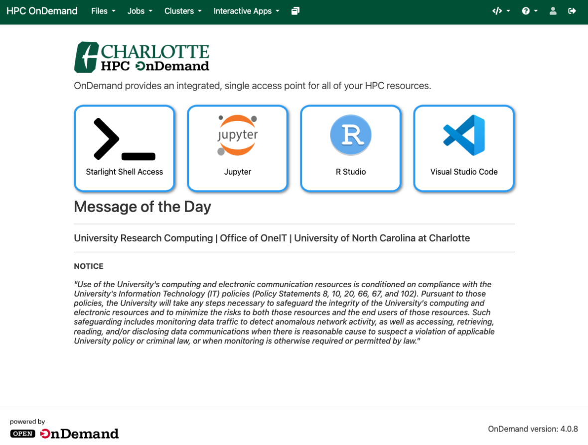 HPC OnDemand is a way for users to run interactive jobs on the Charlotte HPC Research Cluster. Start computing immediately. A simple interface makes HPC OnDemand easy to learn and use. This includes: