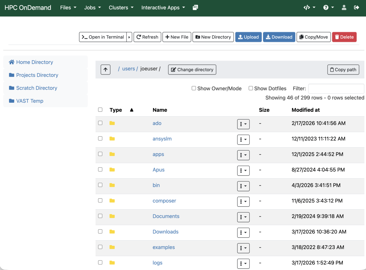 Quickly access and manage your files and directories. Under the “Files” menu, you have 2 menu shortcuts directly to your 2 personal directories: Home and Scratch. There are 2 additional menu shortcuts to the root of Projects and the root of VAST Temp. From there, you should be able to navigate to any of the Project or VAST Temp volumes that you have been granted access to. The file management interface looks like your typical web-based file manager, with options to upload or download files, create new files or directories, copy/move/delete existing files, and even open a terminal for quick and convenient command line access: