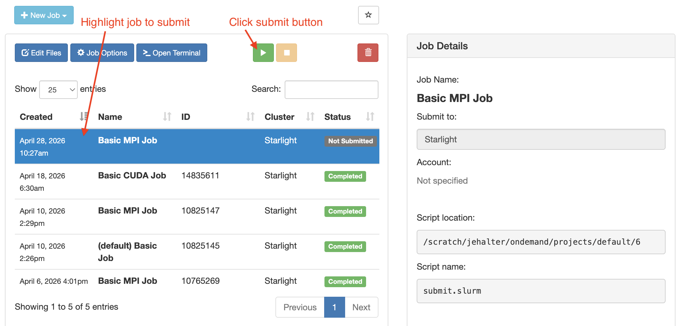 Whichever template you chose will now show up in your list of available jobs that you can submit to the cluster. You can scroll down and look at the contents of the submit script, and you can even edit it by clicking the “Open Editor” button at the bottom of the page (the editor will open in a new browser tab). If you made changes, make sure you save them and close the editor browser tab to return to your job list. When you’re satisfied with your job, make sure the job you want to submit is highlighted in your list of jobs, then click the green submit button: