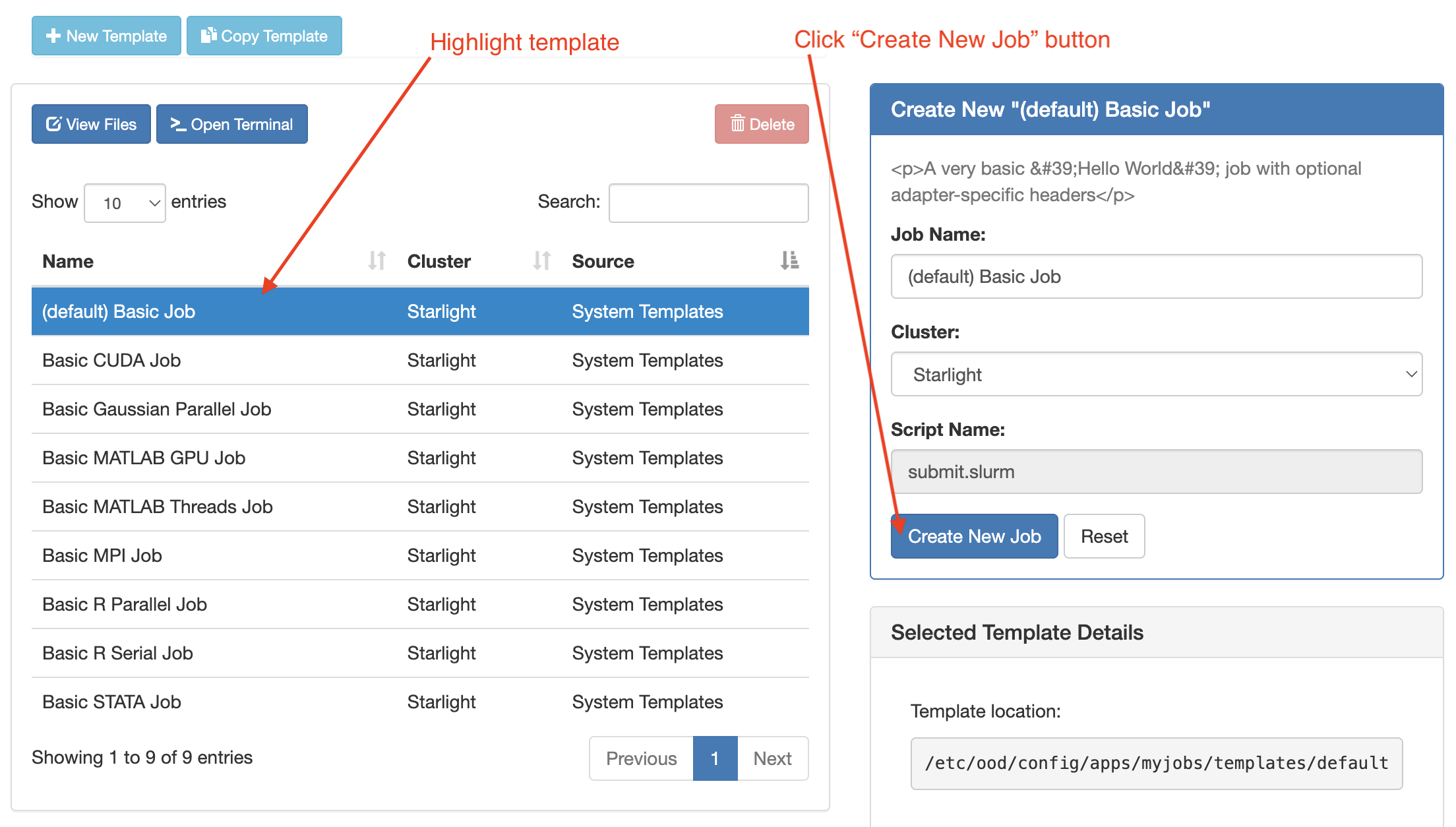 You can quickly access the growing list of example job templates we have by choosing the “Templates” menu at the top of the page. Select one of the templates you would like to submit to the cluster, then click the “Create New Job” button on the right-hand side of the page: