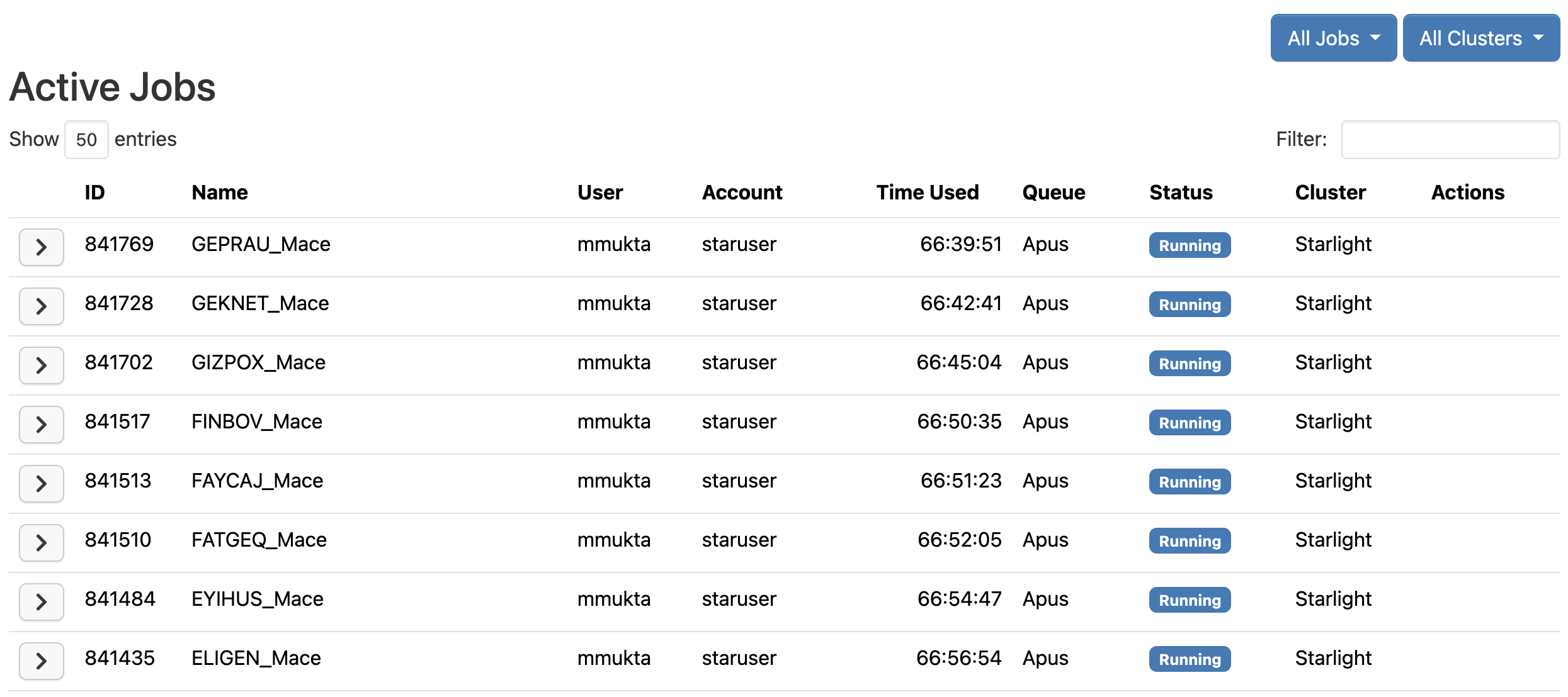 This gives you a listing of not only “active” jobs, but all jobs on the cluster (active, pending, recently completed, etc). It is like a graphical version of “squeue”. You can choose between “Your Jobs” and “All Jobs” by changing the pulldown in the upper right-hand corner. Underneath that you can use the filter field to narrow down the job listings. Useful filters, for example, are: queue (partition) name, job status, job name, etc. - Cluster Status: ( Menu – Clusters -> System Status )